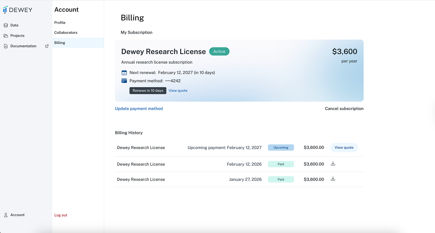 If your payment method is set to invoice, Dewey will ask you to acknowledge your intent to renew starting 60 days before your renewal date. This manual confirmation of each renewal helps ensure the data is still being used appropriately.